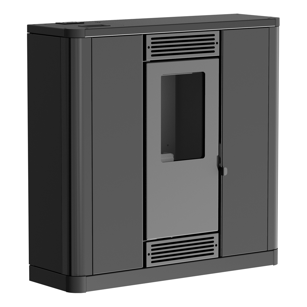 ПЕЛЕТНА КАМИНА БЕЗ ВОДНА РИЗА И ВЪЗМОЖНОСТ ЗА МОНТАЖ НА ВЪЗДУХОВОД - MARELI SYSTEMS AURORA SLIM 11 kW - ИЗГЛЕД ОТПРЕД И ОТЛЯВО